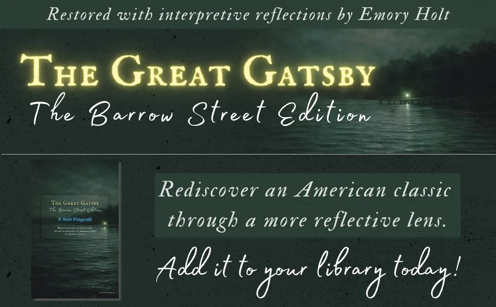 This Barrow Street Edition presents F. Scott Fitzgerald’s public domain novel in a carefully restored text, accompanied by a newly written introduction, chapter-by-chapter reflections, and a concluding afterword by Emory Holt, archivist of The Dunwich Examiner. These additions do not interrupt the reading experience. Instead, they invite the reader to return to the novel with deeper clarity, examining how its symbols, silences, and contradictions continue to speak across generations.